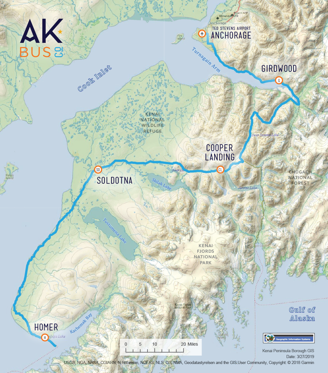 We can pickup/drop-off passengers along the Sterling highway however this must be arranged by phone in advance.