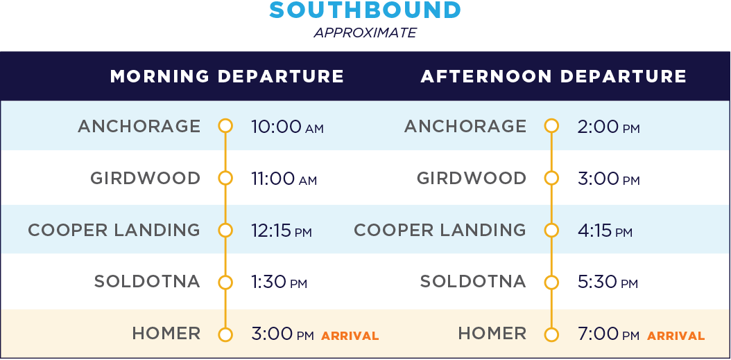Rates are for one-way travel and start at $79 for a single stop and top out at $139 for a full-length trip between Anchorage and Homer.